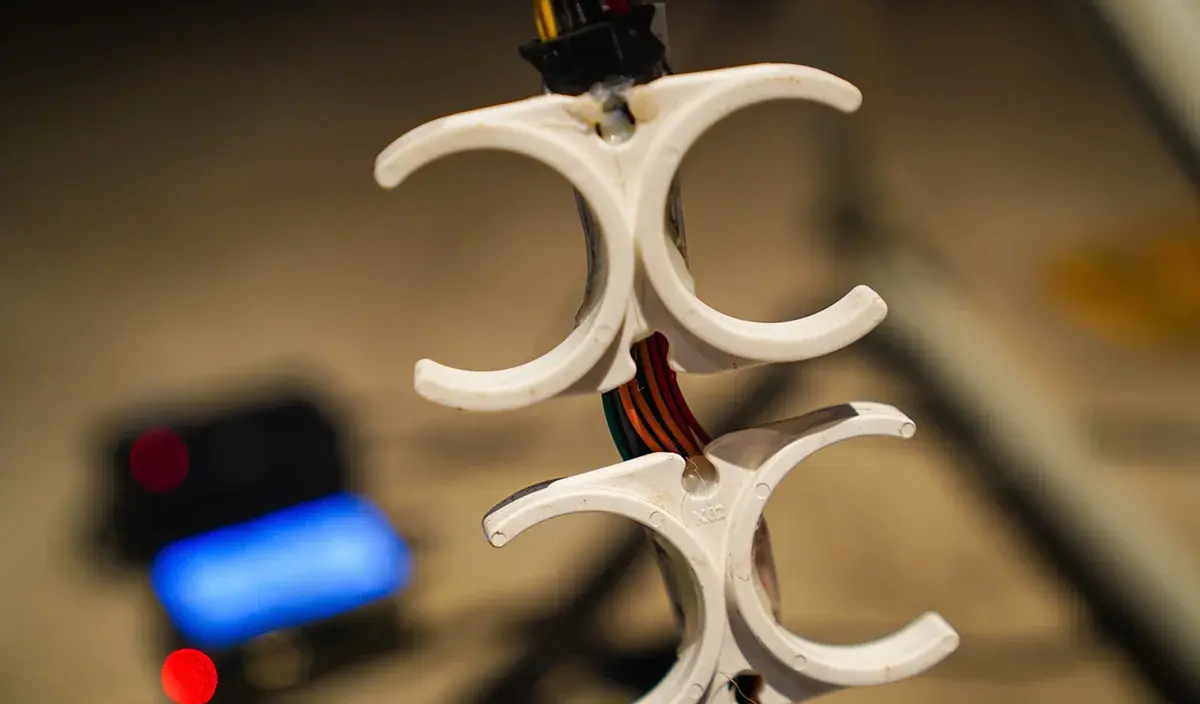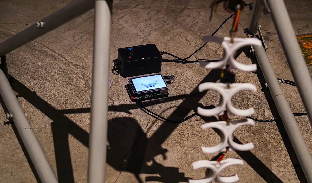 Metal frame of a hammock, hammock swinging machine, old filters of water machine, plastic tube, computer electronic wires, loop video