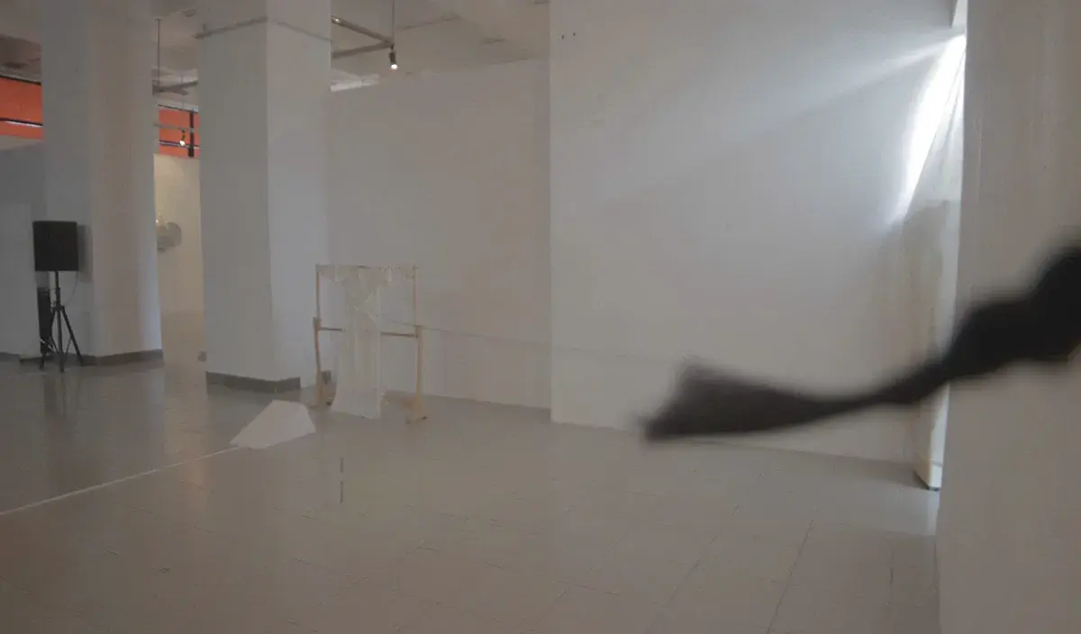 The work consists of the artist’s silk wedding dress, on which a moving image is projected based on the female population data in Vietnam on the website danso.org using p5.js, the dress has a thread connected to a braid, the braid grows from an electrical outlet, under the electrical outlet there are 9 silkworm cocoons.