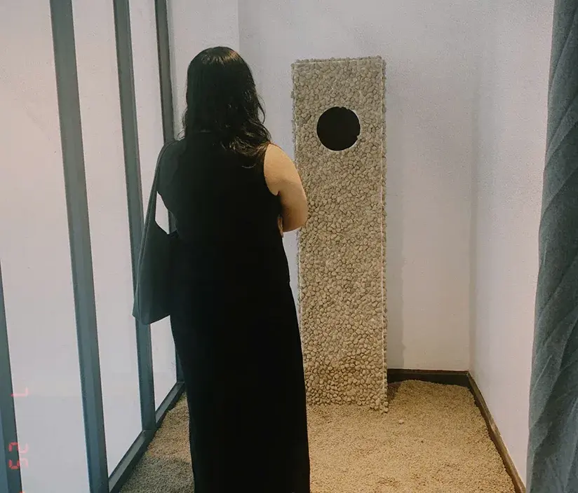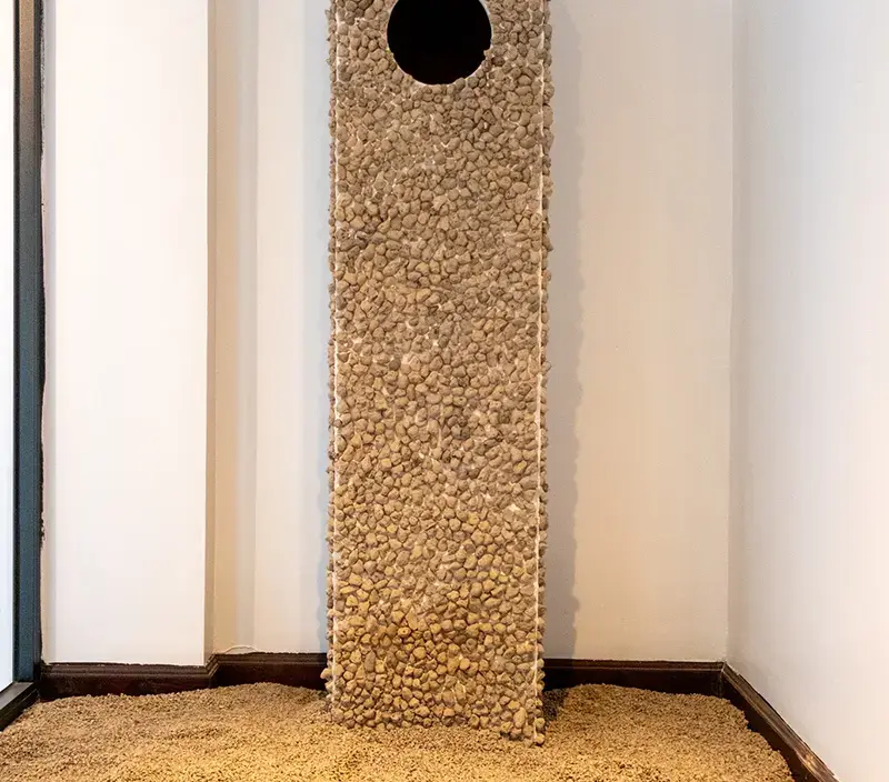 Pillar (Cut-down version) consists of a single column embedded with pumice stones. At its base, smaller pumice stones are scattered. From within the column, a voice recites Marrow by Ursula K. Le Guin in both Vietnamese and English. Audiences are invited to walk across the pumice stones to approach the pillar and listen. Pillar was exhibited at the O At Oh Art Contemporary Art Festival 2025 in Ho Chi Minh City, Vietnam, in July 2025.